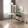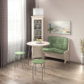 Набор мебели для кухни, включающий в себя: одну прямую скамью, два табурета и круглый стол на металлических ногах. В прямой скамье под сиденьем расположен ящик. Каркас скамейки - ЛДСП. Стол "Лотос": ножки - окрас "серебро", столешница "Термопластик", 24 мм.