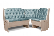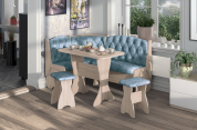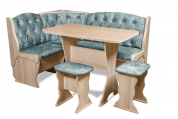 Набор мебели для кухни с классической красивой каретной стяжкой, включающий в себя угловую скамью, стол и два табурета. В угловой скамье под сиденьями расположены два ящика. Каркас выполнен из ЛДСП. Покрытие верхней части столешницы стола - термостойкий пластик, кромка ПВХ – 1 мм. Углы столешницы закруглены для избегания травмирования и придания лучшего эстетического вида.